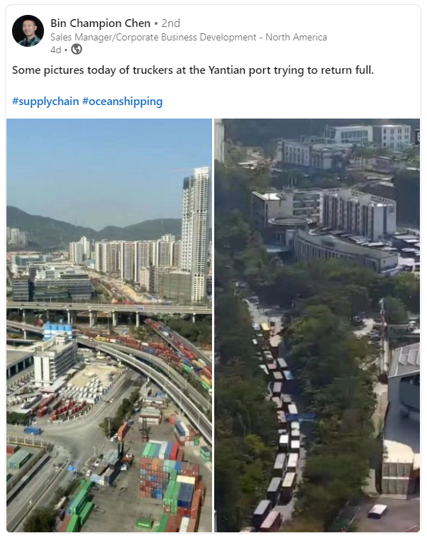 Congestion is also an issue at some ports in Asia. LinkedIn User Bin Champion Chen shared the below images of truckers trying return full to the Yantian port.